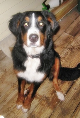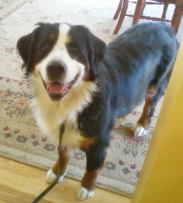 T-Bone as we are calling him was found starving and turned into the pound. He weighed 38 pounds. It was thought he was 1.5 to 2 years old but we think he is more like 10 months.So we are picking his new birthday as Cinco de Mayo, May 5th, 2011. He still has puppy hair on his head and is not lifting a leg yet and not too developed. He is a very small Berner for a male. This may be due to malnutrition for an extended period of time. We don’t think he was on his own for log, so the neglect must have started in the old home. He knows sit,shake, speak and some other commands.