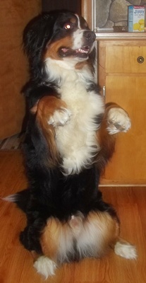 T-Bone has a little different type of personality. He is very loving and cuddly, but can get snotty when there is a lot of excitement with the other dogs like when we arrive home. He gets into a fight with our Bruno and holds his own. He does not do this to the females we have had, so it mat be best that he go to a home with a female dog companion. He has also gotten a snappy a few time when we pushed him off because he was trying to climb up when not invited. He only did this a few times and we were not sure if it was related to pain or not as it was a few weeks ago. For this reason we want a home without small children. He is about 70 pounds and we expect he will stay about that size, so he will be a small Berner. We believe it may be from being malnourshied for so long. He is nicely marked. He has learned to play with toys and his best buddy is our Golden. He had a great time when we too him on vacation. Not a swimmer but learned that the water was nice to wade in.